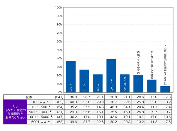 アンケートでは、ファイルの整理などユーザーの工夫で使用を抑えやすい「ストレージ」が38.9%と最も多く、次いで「CPU」(36.8%)、「GPU」(26.7%)、「メモリ」(21.1%)、「ディスプレイ」(21.1%)と続いた。
