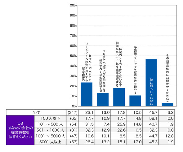「特に何もしていない」(45.7%)を除くと、「発注から納入までのリードタイム設定を長くする(半年程度)」(23.1%)、「特定のメーカーにこだわらず、納期が早いモデルを随時選定する」(17.8%)、「3月までの『値上がり前在庫』を確保すべく早期契約する」(13.0%)、「予備機(ストック)の保有数を増やす」(10.5%)と続き、特定のメーカーにこだわらず早く届くPCを都度選ぶという実利重視の動きをとる企業が目立つ(図2-1)。