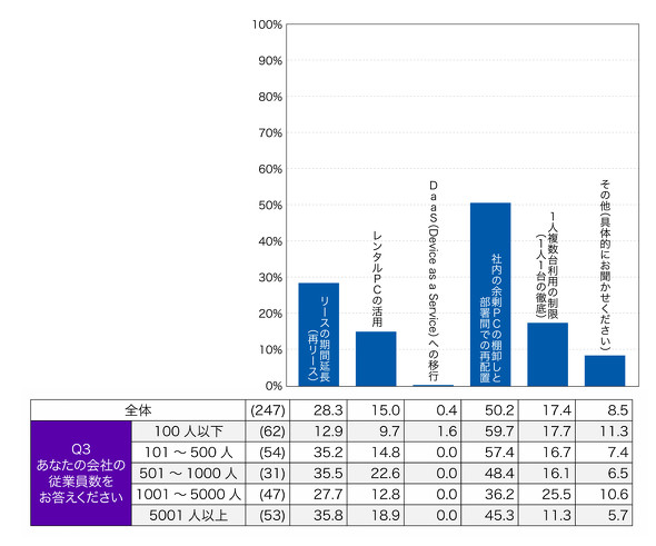 関連して、PCの調達・運用コストを抑えるために検討あるいは実施している手法を聞いたところ、「社内の余剰PCの棚卸しと部署間での再配置」(50.2%)、「リースの期間延長(再リース)」(28.3%)、「1人複数台利用の制限(1人1台の徹底)」(17.4%)が続いた(図2-2)。