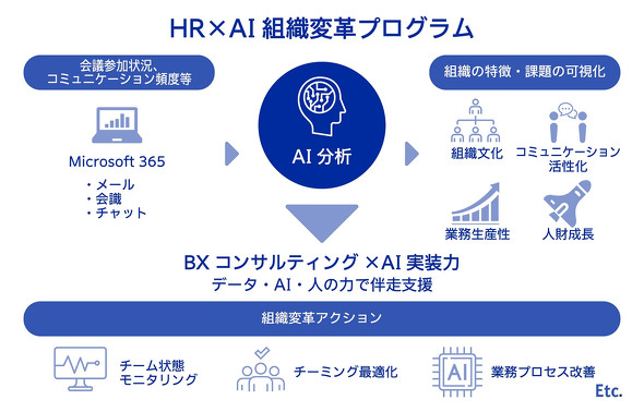 こうした事情を踏まえ、電通と電通総研は、多くの企業で業務基盤として利用されているMicrosoft 365に蓄積されたデータに着目し、組織行動を可視化・分析することで、課題の特定から変革の実行までを一貫して支援するHR×AIの組織変革プログラムを開発した。