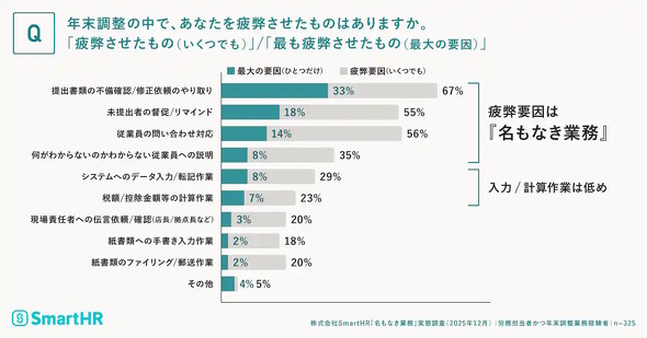 人事労務分野のクラウドサービスを提供するSmartHRは2026年4月7日、「『名もなき業務』実態調査(2025年12月)」の結果を公表した。年末調整や各種手続きのシステム化が進む一方で、従業員への周知や確認、問い合わせ対応、督促といった周辺業務が、依然として担当者の負担になっている状況が明らかになった。