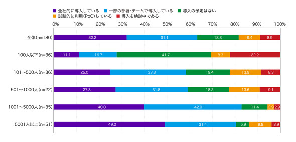 まず、議事録AIの利用状況を尋ねたところ、「全社的に導入している」(32.2%)、「一部の部署・チームで導入している」(31.1%)となり、合わせると63.3%。さらに「試験的に利用(PoC)している」(9.4%)を含めると、何らかの形で議事録AIを利用している企業は約7割に上る。この結果を企業規模別に見ると、従業員数1001人以上の中堅〜大規模企業では導入率が8割を超えていることが読み取れる(図1)。