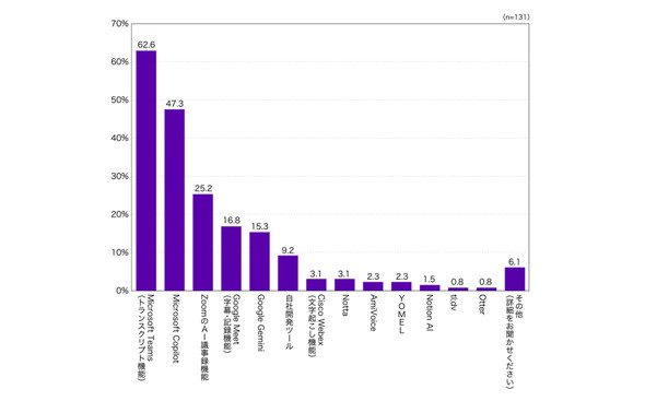 次に、利用している議事録ツールの内訳を見ると、「Microsoft Teams(トランスクリプト機能)」(62.6%)、「Microsoft Copilot」(47.3%)が上位を占め、「ZoomのAI議事録機能」(25.2%)、「Google Meet(字幕・記録機能)」(16.8%)、「Google Gemini」(15.3%)、「自社開発ツール」(9.2%)が続いた(図2)。既存のワークスペースに組み込まれた機能の利用が中心であり、新たに専用ツールを導入するというよりも、現在利用している会議ツールの機能として議事録AIを活用しているケースが多いことが分かる。