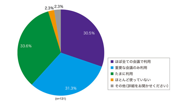 また、利用頻度については、「たまに利用」(33.6%)と「重要な会議のみ利用」(31.3%)が、「ほぼ全ての会議で利用」(30.5%)を上回り、全体として6割以上が限定的な利用にとどまっている。