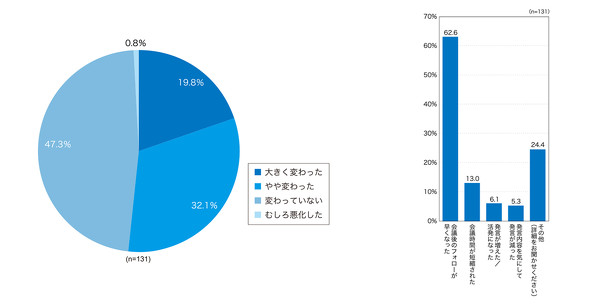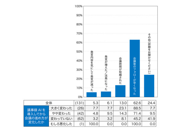 議事録AIの導入により、会議後の議事録作成だけでなく、会議の進め方にも変化が生じているのか。本調査では、利用者の実感を尋ねた。