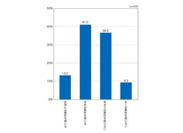 今回の調査で特徴的だったのが、「生成AI機能の継続的なアップデート」「AI機能の搭載」「文書管理が使いにくいため、AI機能による改善を期待」など、AI機能の強化を求める声だ。実際に、「グループウェアにAI機能は必要か」を問う設問では、「非常に必要性を感じる」(13.2%)と「まあ必要性を感じる」(41.0%)を合わせて54.1%が必要だと回答した(図3)。中でも、従業員数500人以上の中堅・大企業においては6〜7割がAI機能の必要性を認識しており、特に強いニーズがあることが分かる。